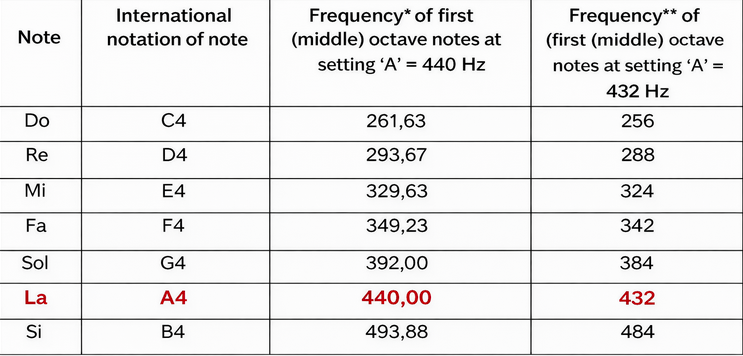 Table 1 presents, for comparison, the frequencies at which the notes of the first (middle) octave should sound when tuning the note “A” to 440 Hz and 432 Hz.