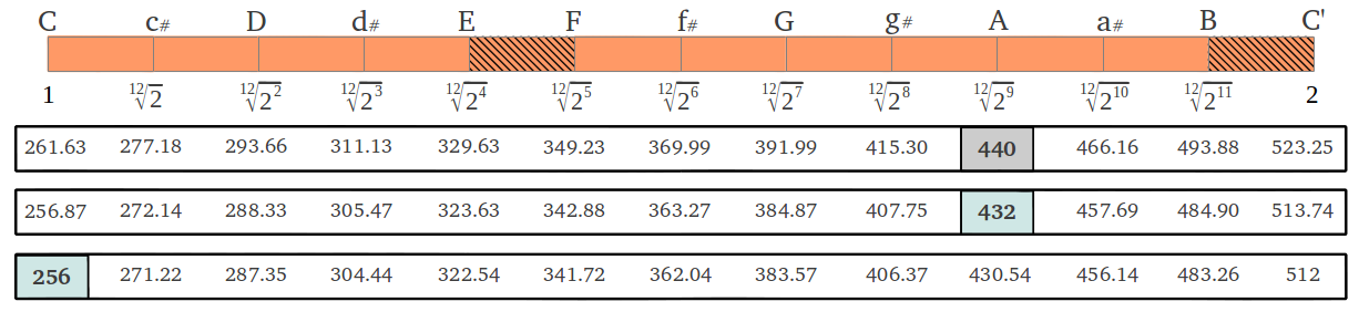 A comparison of frequencies shows how notes differ when tuned to A = 440 Hz versus A = 432 Hz.